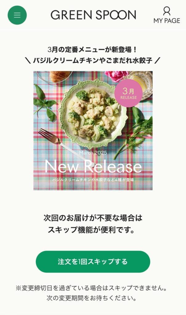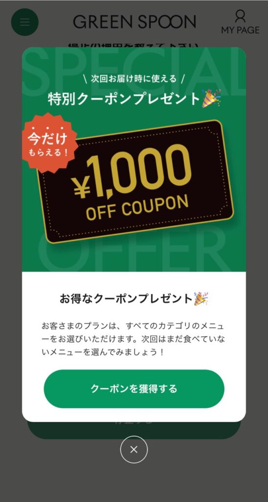 初回の割引についてはGREEN SPOON からページに飛んでもらえれば割引が適用されるのでぜひご利用ください。
