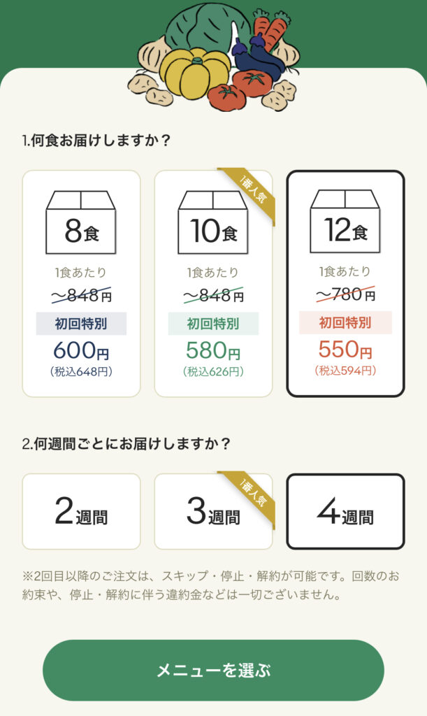 次に何食をどのくらいの頻度で届けるか選択し、「メニューを選ぶ」をタップ。