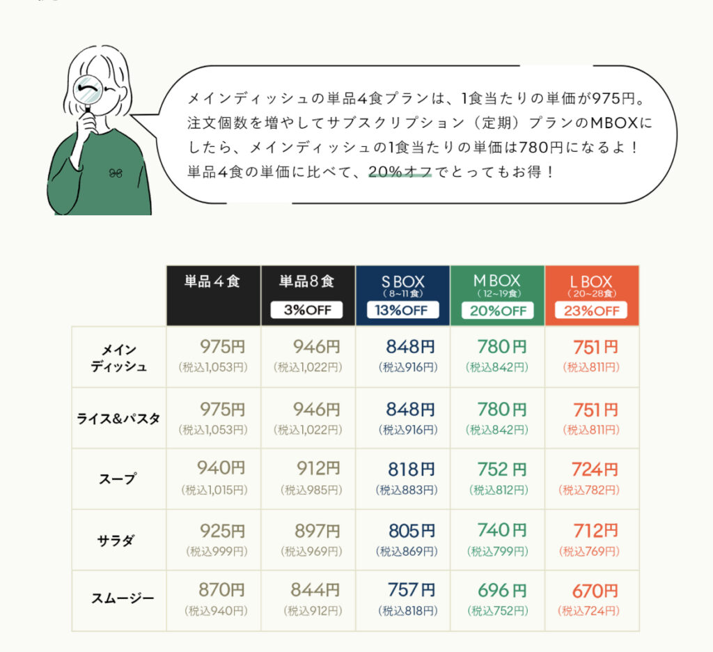 定期配送のLBOXについては20-28食を同時に頼むプランになり、23%の割引が適用されます。