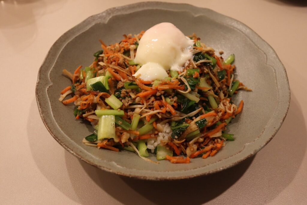 野菜を切って付属の調味料を入れて炒めて、炒めたお肉とあわせて付属の半熟卵を乗せる感じです。