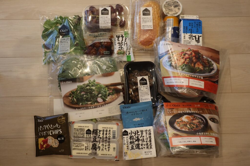 ミールキット3種類のほか、まいたけや野菜、ジュース、牛乳などいろいろとはいっています。